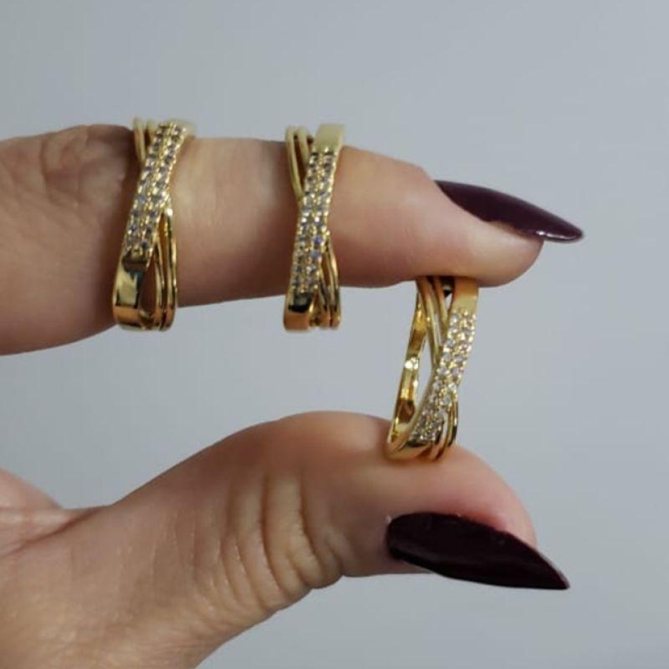 Elegância em cada detalhe. Este anel apresenta um design moderno com fileiras entrelaçadas, onde o brilho intenso das zircônias se destaca sobre o metal polido, criando um visual sofisticado e atemporal. Disponível nos banhos de ouro e ródio branco, é a escolha perfeita para quem busca uma joia versátil e cheia de glamour.